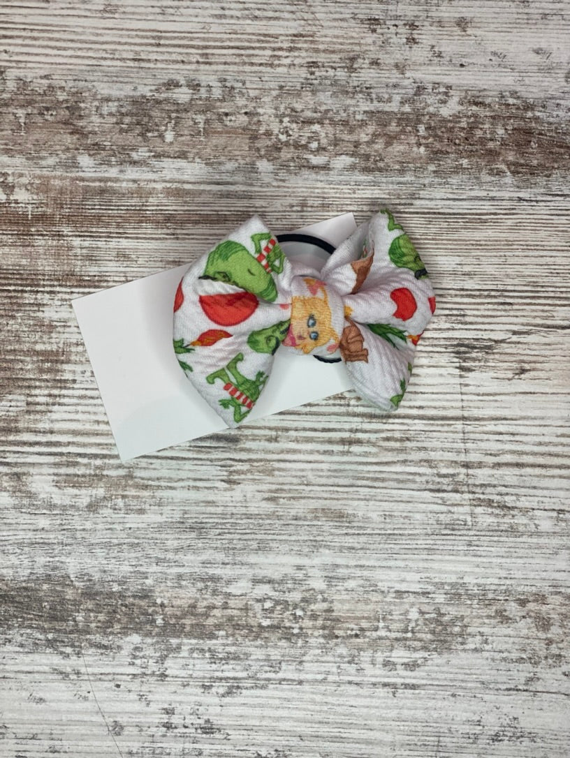 Waffled Texture fabric bow, makes it look super adorable, hand tied on our one size fits all on small hair tie. Bow is approximately between 2"-3"